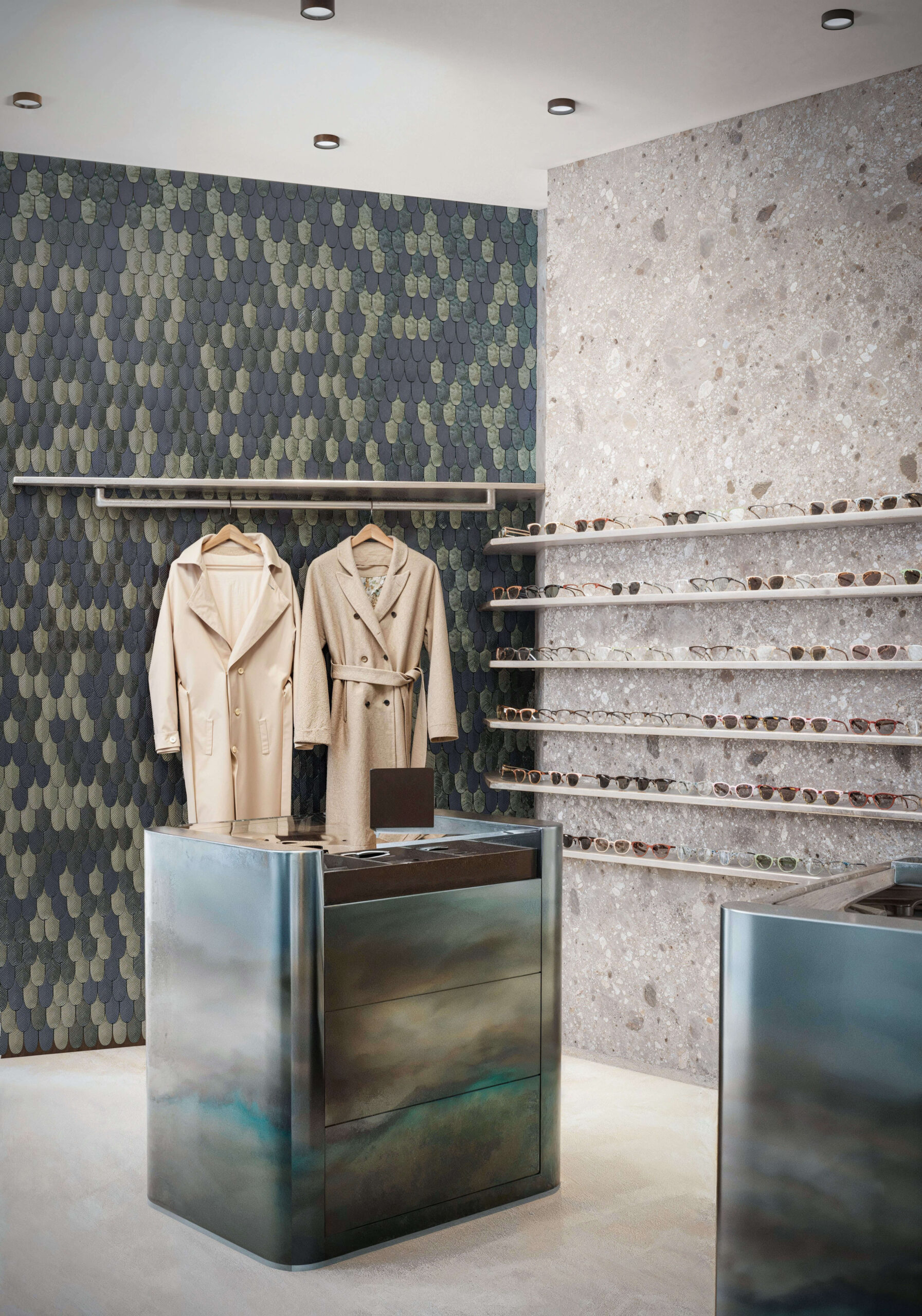 Die Materialisierung und die feinen Details erinnern an einen Gletschersee, welcher die Regionalität des Geschäfts betont. Schlichte Nuancen in Grün und Blau schaffen dabei eine optische Aufmerksamkeit, ohne den Hauptfokus der Ladenfläche – die Produkte – zu konkurrenzieren. So entsteht eine einladende, moderne Gesamtwirkung.